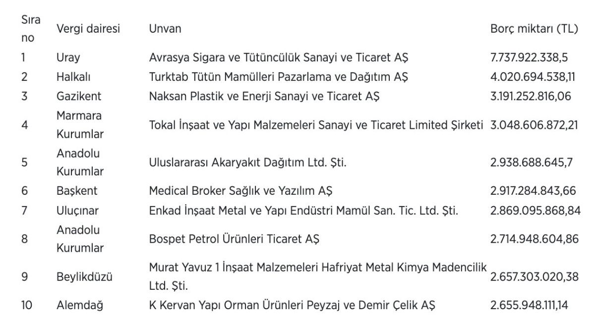 Borçlular listesinin ilk sırasında 7 milyar 737 milyon 922 bin lirayla Uray Vergi Dairesine kayıtlı Avrasya Sigara ve Tütüncülük Sanayi ve Ticaret AŞ yer aldı.
