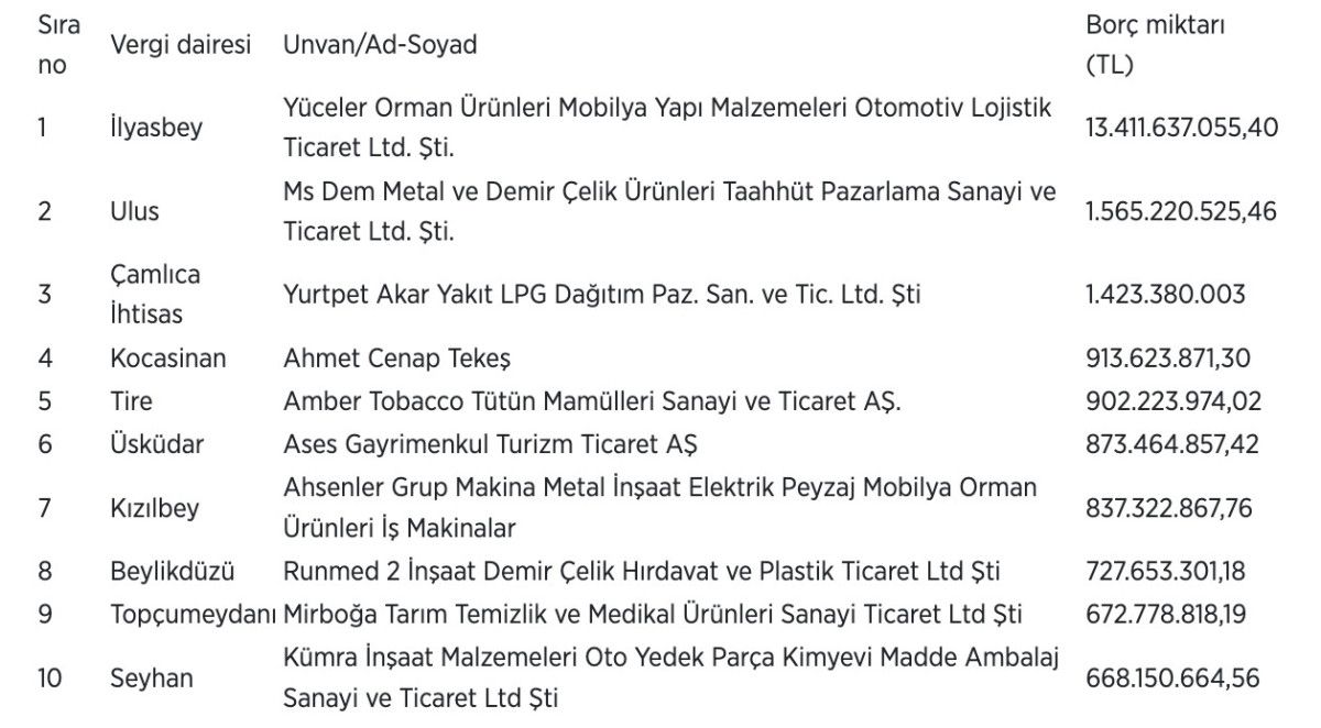 Listede, İlyasbey Vergi Dairesine kayıtlı Yüceler Orman Ürünleri Mobilya Yapı Malzemeleri Otomotiv Lojistik Ticaret Limited Şirketi 13 milyar 411 milyon 637 bin lirayla ilk sırada yer aldı. Bu şirketi 1 milyar 565 milyon 221 bin lirayla Ms Dem Metal ve Demir Çelik Ürünleri Taahhüt Pazarlama Sanayi ve Ticaret Limited Şirketi ve 1 milyar 423 milyon 380 bin lirayla Yurtpet Akar Yakıt LPG Dağıtım Paz. San. ve Tic. Ltd. Şti izledi.