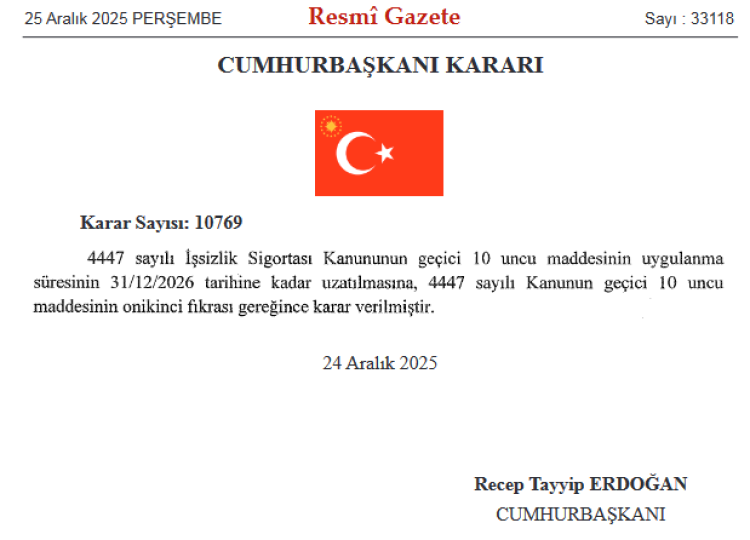 ANKARA (İGFA) – Bugünkü Resmi Gazete’de yayımlanan Cumhurbaşkanı Kararı ile 4447 sayılı İşsizlik Sigortası Kanunu’nun Geçici 10 uncu Maddesi’nin uygulanma süresi uzatıldı.